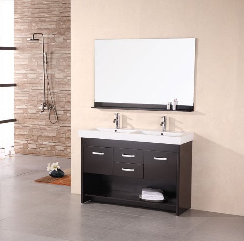 FeaturesSolid oak wood cabinetEspresso FinishIntegrated porcelain drop in sink with overflow drainChrome pop up drainLarge mirror with espresso shelf Design Element DEC074 Citrus 48-Inch Double Sink Vanity Set?
