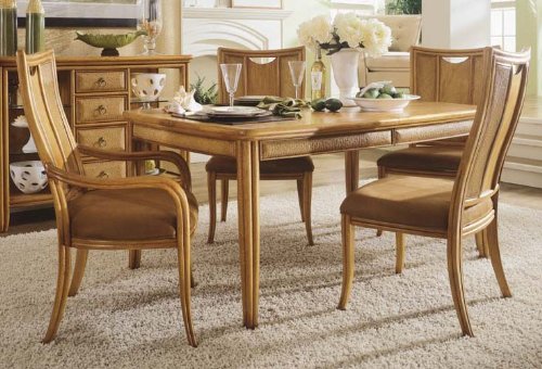 #The Antigua Leg Table by American Drew is a combination of popular materials, finishes and shapes blended together for today's lifestyles. Wide and convenient,this wood dining tableincludes one 20'' leaf that extends it to 84''. Featuring sturdy construction, this kitchen dining table is crafted from primavera veneers and select hardwoods and rendered in Toasted Almond finish. The basket weaved wicker inserts add more exclusiveness to this piece. With its unique style and warm color, the leg table from the Antigua Collection is sure to add a sophisticated coastal or tropical flare to any dining room setting. It is usually in stock and ships to you at no additional charge.Features:Primavera veneersSelect hardwoodsCoastal/Tropical influencesOne 20'' leaf that extends it to 84''Finish:Toasted AlmondDimensions:Leg Table (American Drew Model# 931-760): W64 D44 H30