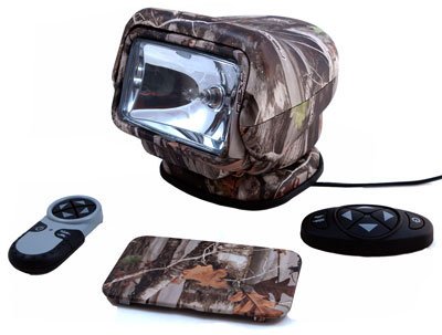 Magnalight Golight Stryker 3085-M Wireless Remote Control Spotlight - 2 Remotes - Magnetic - Camo . GOLIGHT OVERVIEW (All information COPYRIGHT MAGNALIGHT 2004-2011)Model: Golight StrykerColor: Camouflage (black, white and chrome models available) Pan and Tilt: 370 degrees rotation with hard stop. 140 degrees tilt to direct upward beam positionMount: Magnetic - water tight 100 pound grip base - tested to 60mph - Magnetic base encapsulated in soft rubber to adapt to uneven vehicle surfaces and prevent scratches on vehicle paint. - Wrap around base seal prevents dirt from entering the base of the light. Includes rubber cord grip.Voltage: 12 Volts DC appropriate for most consumer vehicles, off road vehicles and small boats (24 Volts DC available in the 24 Volt Golight Light Category)Lamp Wattage: 65 WattsAmp Draw: 5.5 amps on 12 Volts DCCord: Detachable 16 foot, out door rated cord with cigarette plug. 2 pin trailer plug connects cord to Golight. Beam: Wide Spot beam - effective working beam of 850 feet (can read a book at 850 feet)Lamp Construction: Phillips bulb and glass lens/reflector assembly (Golight spare bulbs available here)Industrial Candlepower Rating: 500,000 (original GE formula used in OEM/industrial) more on candlepowerRetail Candlepower Rating: 6.5 million (newer formula used in retail stores) more on candlepowerRemote Type: WirelessRemotes Included: Handheld and Dash Mount - battery operatedDimensions: 6 inches wide by 6 inches deep by 7 inches tallWeather Rating: WeatherproofWarranty: 5 YearsOutdoor Applications: All vehicles, boats, heavy equipmentOther Applications: home and building security (with AC/DC converter)GOLIGHT REMOTE CONTROLLED LIGHT REMOTES:Golight Remote Control Type(s): Wireless. Radio based, 433 MHz (not infrared). No wiring required. Remotes powered from internal 12 volt batteries (included) that last approximately 1 year. Small red LED light indicates active remote button. Golight remote controls effective to 150 feet through all manner of wall buildings an
