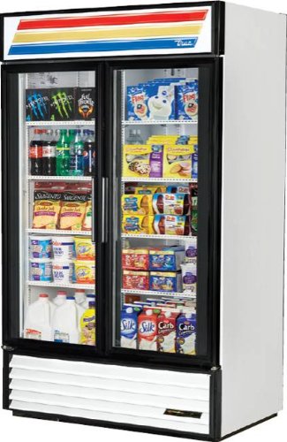 True GDM-43, 2 Door, Glass Swing Door Refrigerator - The world's #1 manufacturer of glass door merchandisers. - Oversized, factory balanced, refrigeration system holds 33°F to 38°F (.5°C to 3.3°C). - Exterior - non-peel or chip white laminated vinyl; durable and permanent. - Interior - attractive, NSF approved, white aluminum interior liner with stainless steel floor. - Self closing doors. Positive seal, torsion type closure system. - "Low-E", double pane thermal insulated glass door assemblies with mitered plastic channel frames. The latest in energy efficient technology. - Patented integrated door light (IDL) system for brighter, shadow free illumination. - Entire cabinet structure is foamed- in-place using Ecomate. A high density, polyurethane insulation that has zero ozone depletion potential (ODP) and zero global warming potential (GWP). Bottom mounted units feature - "No stoop" lower shelf to maximize product visibility. - Storage on top of cabinet. - Easily accessible condenser coil for cleaning.
