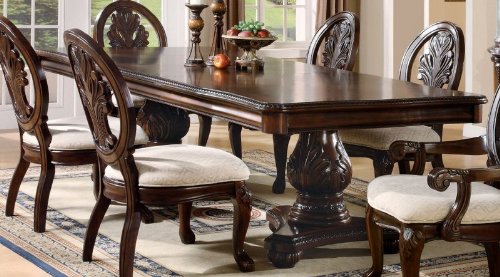 #Gather around the traditional style of the rectangular double pedestal dining table, with its sculpted legs and edging. Add the dining side and arm chairs for a complete dining set. Features: Cherry finish Constructed of birch solids and veneers Traditional style Brushed metal hardware. Intricate carvings in table edges, cabriole legs, and pedestal bases. Sculpted Edge Rectangular shape Double Pedestal Includes 24 inch leaf Table Extend from 84 Inches to 108 InchesSpecifications: Overall dimensions: 31H x 84-108W x 47D inches Weight: 292.82 lbs.