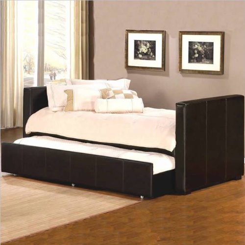 Marcella Daybed w/Trundle - Hillsdale 1518DBT?Hillsdale Furniture's unusual Marcella daybed boasts a brown leather upholstered urban backless" design, a transitional angular silhouette, and attractive stitched accents.Features an upholstered trundle pull out for an additional twin mattress. It is usually in stock and ships to you at no additional charge.Dimensions:Daybed (Hillsdale Model 1518DBT) 88.5" L x 42" W x 45" H"